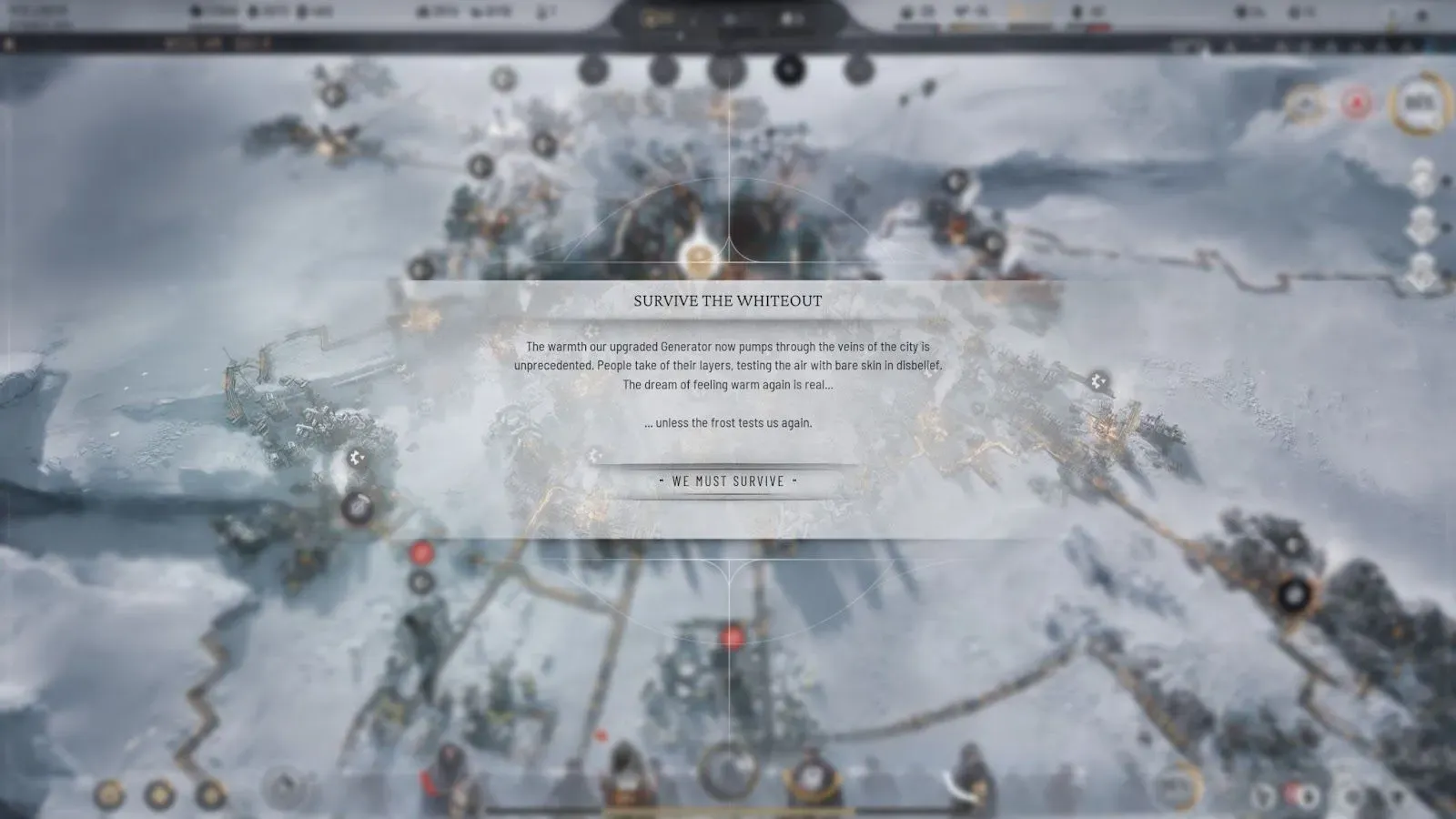 But getting back to the whole “too big for its own good” thing, the problem with establishing a civilization instead of a simple city is that doing so means Frostpunk 2 lacks a lot of the character of its predecessor. Although there are still occasional dialogue pop-ups from your citizens telling you how good (or, as is often the case, bad) you’re doing as a ruler, its narrative just isn’t as human as Frostpunk, or 11 bit studio’s other fantastic title. Although there is still a narrative, albeit a pretty loose one, it’s simultaneously not hopeful and not depressing enough for a game set in the end times. It also quickly falls by the wayside, because, again, Frostpunk 2 rarely gives you time to participate in it. You always need to manage something, and so it's nigh-impossible to focus on the small things, like the individual deaths of New London’s residents or the consequences of any one of your numerous actions. There are simply too many things you need to take care of in the title, so it’s simply not possible to care about most of them in any real way like you can in smaller scale strategy games.