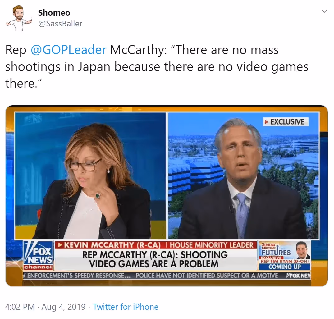 Seriously, these are the people elected to office in America? I understand that not everything can be known by everyone, but the leader of the GOP should know Japan has video games and the leader of the free world shouldn’t peddle untruths so unashamedly. I guess that’s the way of the world, right now though, isn’t it? Well, it shouldn't be. Games do not cause violence, and nor do mental health issues. Each of these things, and more, may be a part of the life of any of these mass murderers. Also, they might not. Doing something about games will not stop mass shootings as they are not the cause. Politicians suggesting otherwise, supported by ill-informed understanding, is wrong and further suppresses the role video games have to play in many people’s lives for good.