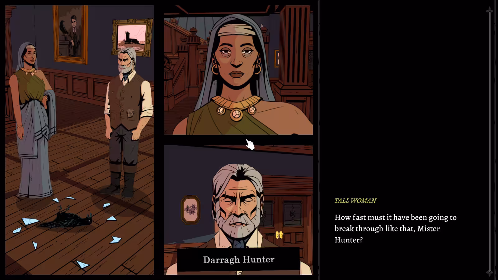 Visually, it’s a gorgeous departure from the chunky pixels of The Darkside Detective team’s earlier work. The game wears a comic-book aesthetic like a skin; panels, inks and stylised character portraits give the whole experience a readable, tactile clarity that keeps the atmosphere vivid without hiding behind photorealism. The manor itself is immaculately staged: rooms feel occupied, personalities leak from possessions, and the place has the lived-in, half-remembered feel of somewhere people stay because they have to, not because they want to. The sound design backs it up with creaking timbers, distant murmurs and the occasional very deliberate silence. I kept getting the feeling the game was listening with me — that’s rare, and it’s brilliant.