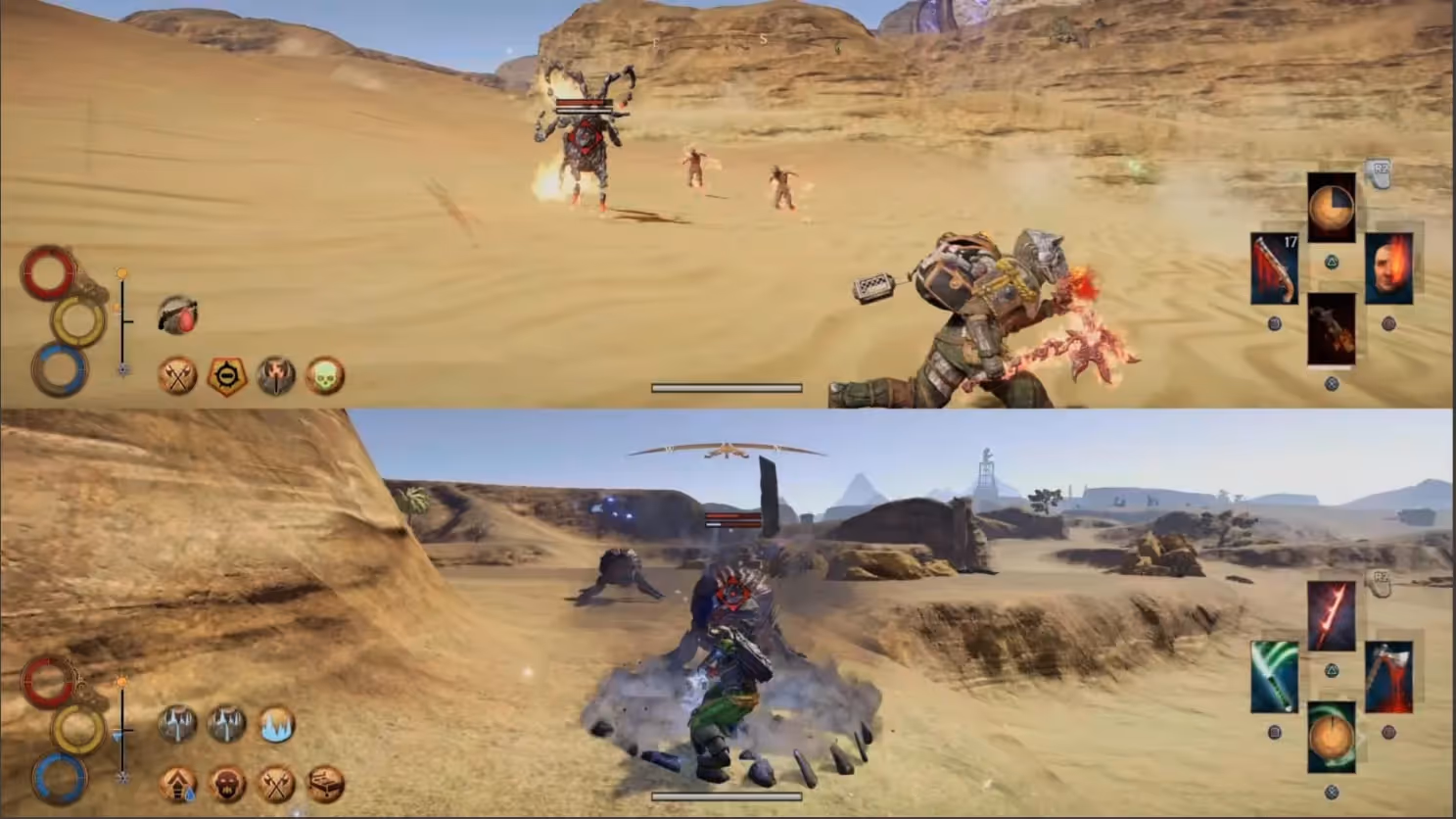 That’s it. It doesn’t tell you how to do it, or where to go. You are on your own. This is not your normal game. We ran around excitedly looking at stuff and finding rubbish bits of loot in bins, filling our limited inventory with wood, and generally doing all the useless stuff people do when they have no idea what they’re doing. The guy at the doors to the city told us to forget going outside (evidently he hadn’t invested in our disastrous voyage, but maybe he had read some of my previous columns for this site). Apparently, we wouldn’t last five minutes out there without a weapon, a backpack and a waterskin. I think we cobbled together a machete and a sword and then I found a storage area, persuaded my son to come with me (when playing with two players, you can only change areas together), and promptly fell off a ledge without reading the sign next to it, which said there’s no way back to Cierzo if you go this way.