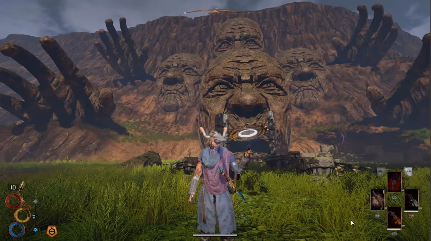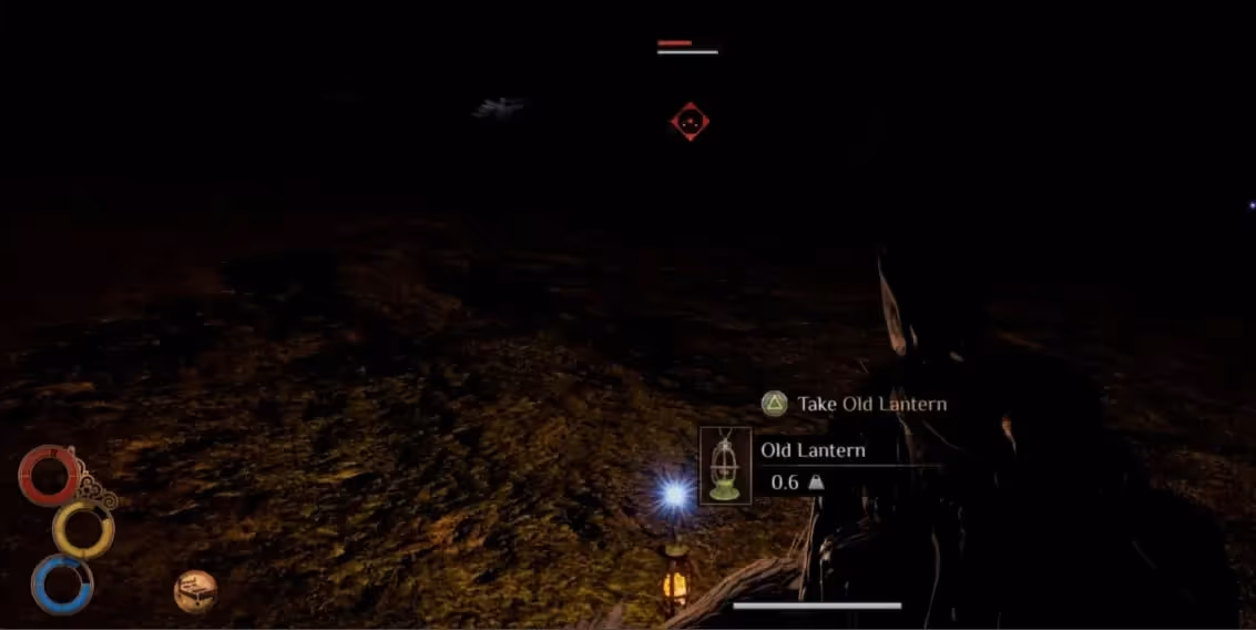 Three wheels in the corner of your screen area show your health, stamina and, when you finally learn magic, mana. Within each wheel you have a light area, which is useable and depletes when you get hit, take a swing, or cast a spell. You also have a dark area, which is “burnt” and no longer useable. If you use up lots of your light area too quickly, some of it will end up “burnt”. Stamina will regenerate over time when you aren’t sprinting or attacking, but the burnt area will not. Health and mana can be replenished by potions, but not if it is burnt. This way, you get to a position where the only thing you can do to restore your wheels to full is to camp, or take one of the few consumables that can restore a small amount of burnt health. The longer you sleep, the more of the burnt areas are restored, but if you are too hungry or thirsty, the game will not allow you to sleep for as long as you need, or you will die.