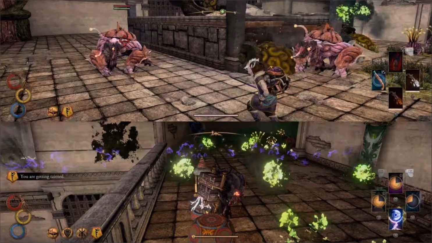 When you emerge from a victory, laden with loot (but not too much loot - you can’t carry everything you find), you try and work out where the hell you are. You have a map of the area you are in, but no idea of whereabouts on it you actually are. So you have to look for landmarks. You split up a bit, both confident you know where you’re going. One of you gets in trouble, or finds something interesting to explore. You get decisions to make. Maybe you’re running low on health, or food, or both. Or the snow has come and you are beginning to freeze. Do you make a fire and camp? It’s getting dark. But you are so hungry, maybe you should just run through the night and find a town. But you don’t know where you are, and navigation is next to impossible at night. And now your lamp has run out; you should have picked up more oil. You’ve found a tree and you’re making a campfire in the pitch black, but what are those lights coming towards you? It’s the eyes of a predator that has seen you, and now you’ll have to fight it in the dark on the edge of a cliff. This doesn’t look good…